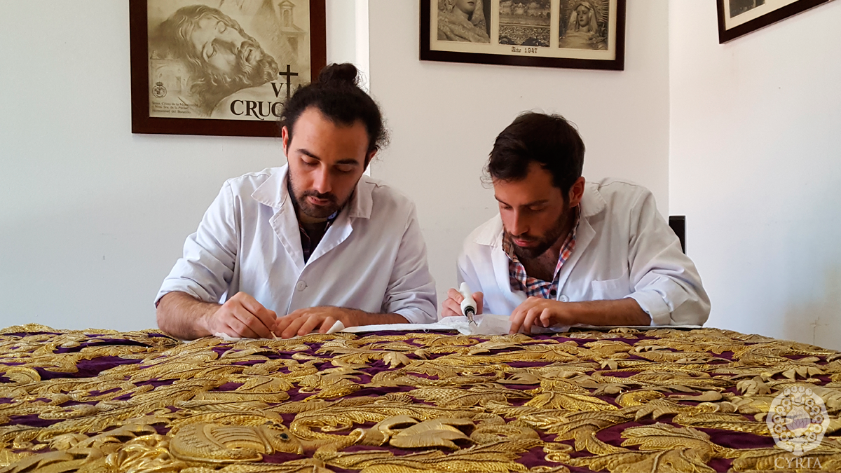 CYRTA llevó a cabo el trabajo de retirada de cera del manto de salida de la Virgen de la Caridad que bordara, en 1964, el taller de Sobrinos de José Caro para la Hermandad del Baratillo.