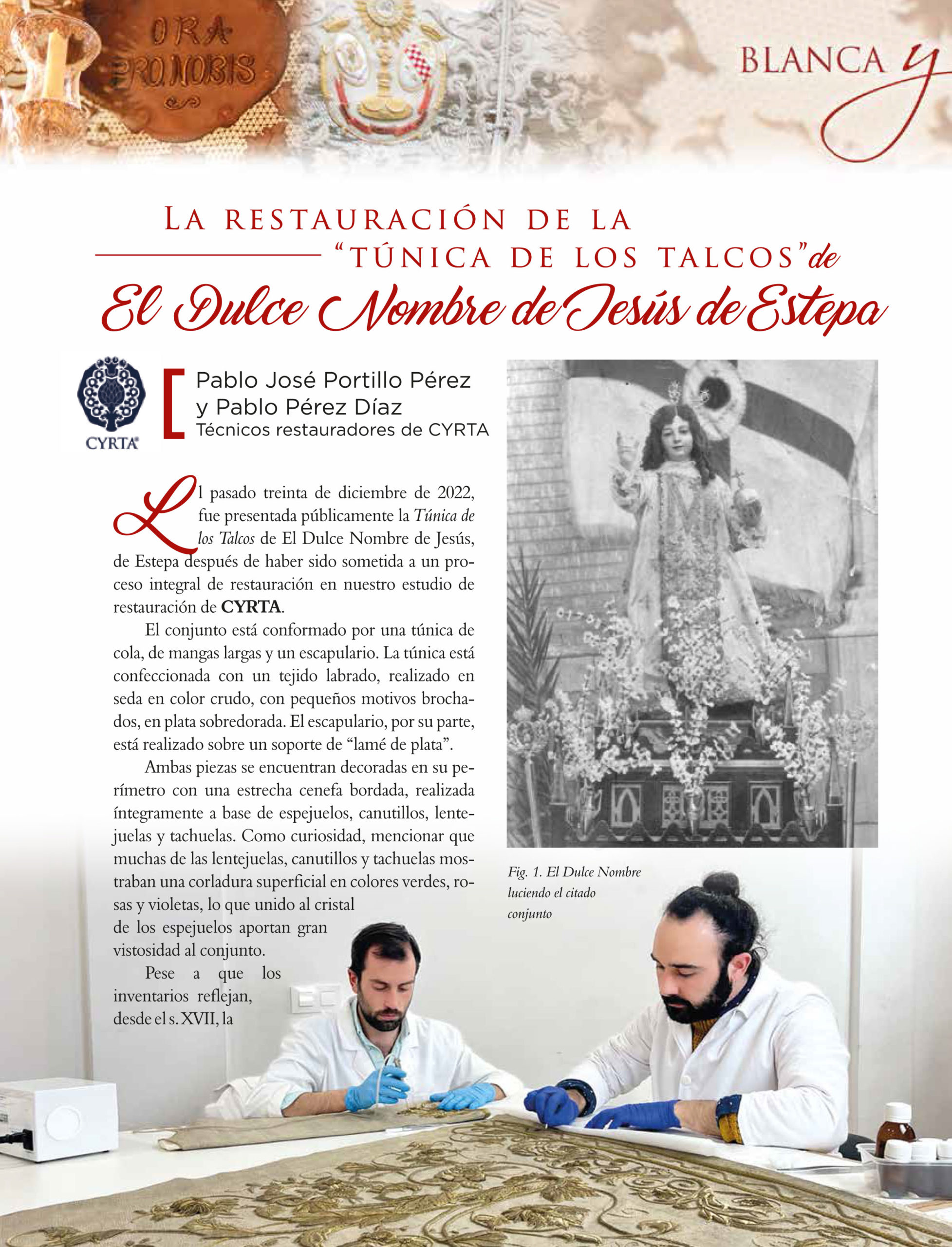 A continuación podrás leer el artículo íntegro que hemos escrito para la revista ‘Blanca y Colorá‘, editada por la Hermandad en esta Cuaresma 2023. En la publicación explicamos todo el proceso de restauración de esta pieza, estado de conservación inicial, tratamientos de Conservación y Restauración que se han aplicado, así como datos históricos, artísticos y técnicos de esta excepcional pieza del Patrimonio Textil de la Hermandad del Dulce Nombre de Estepa.