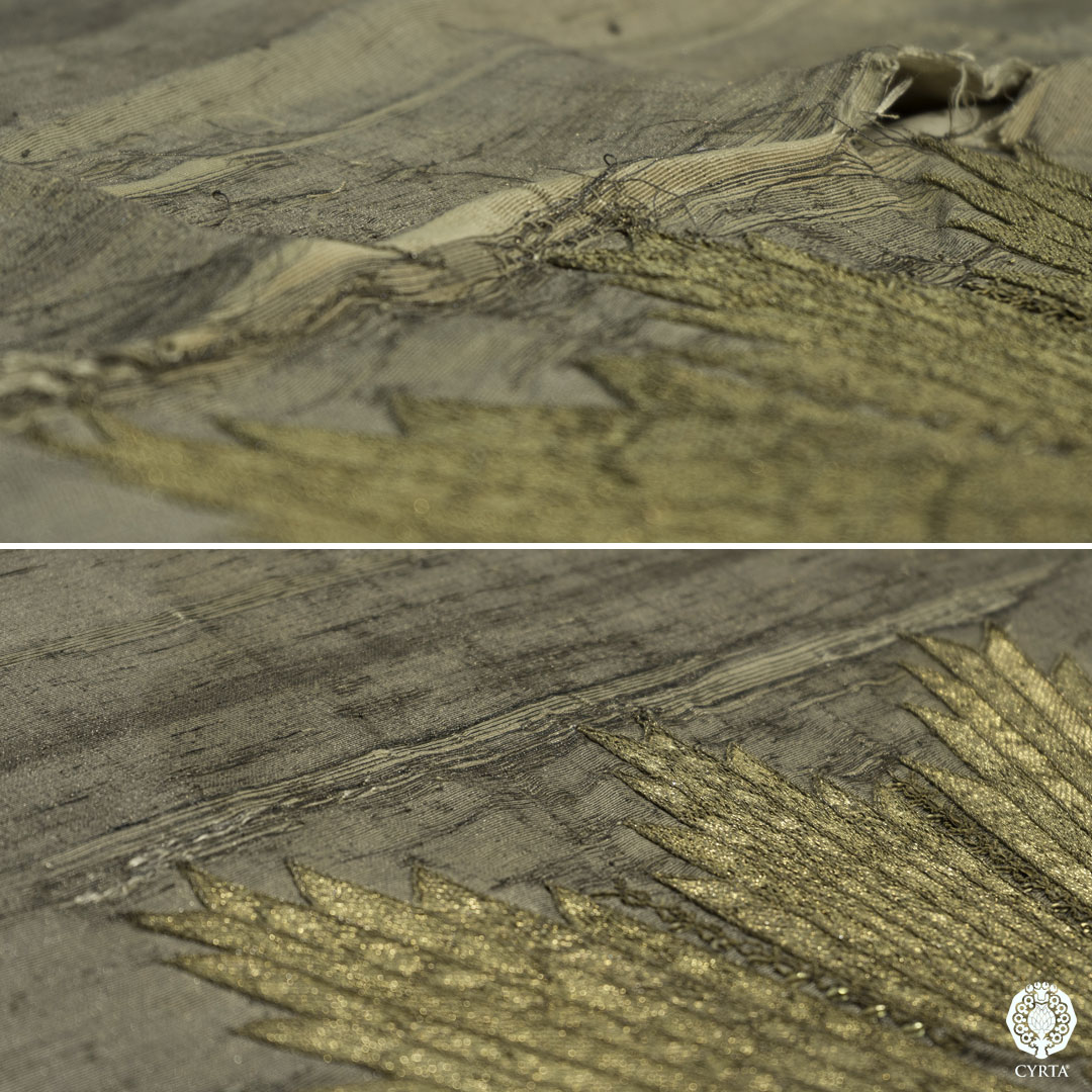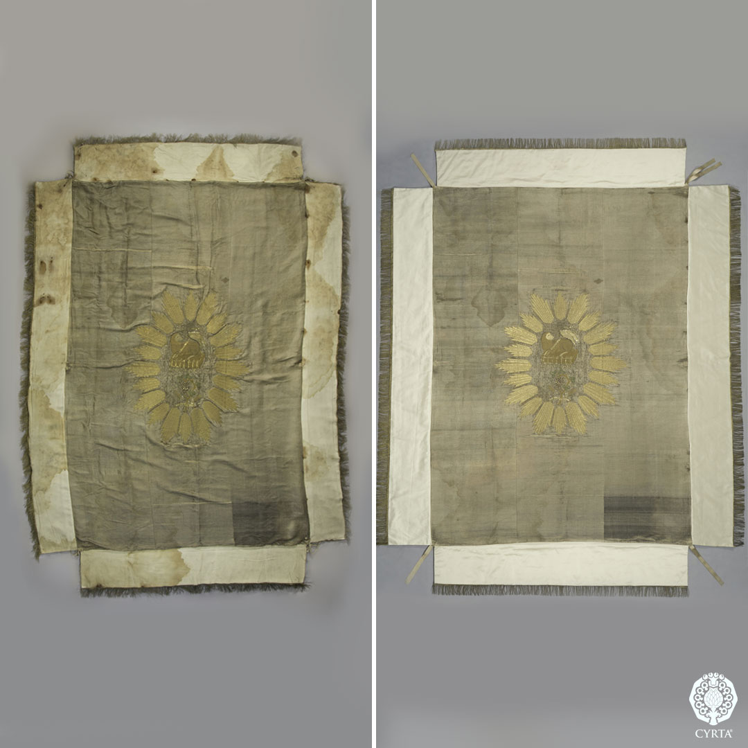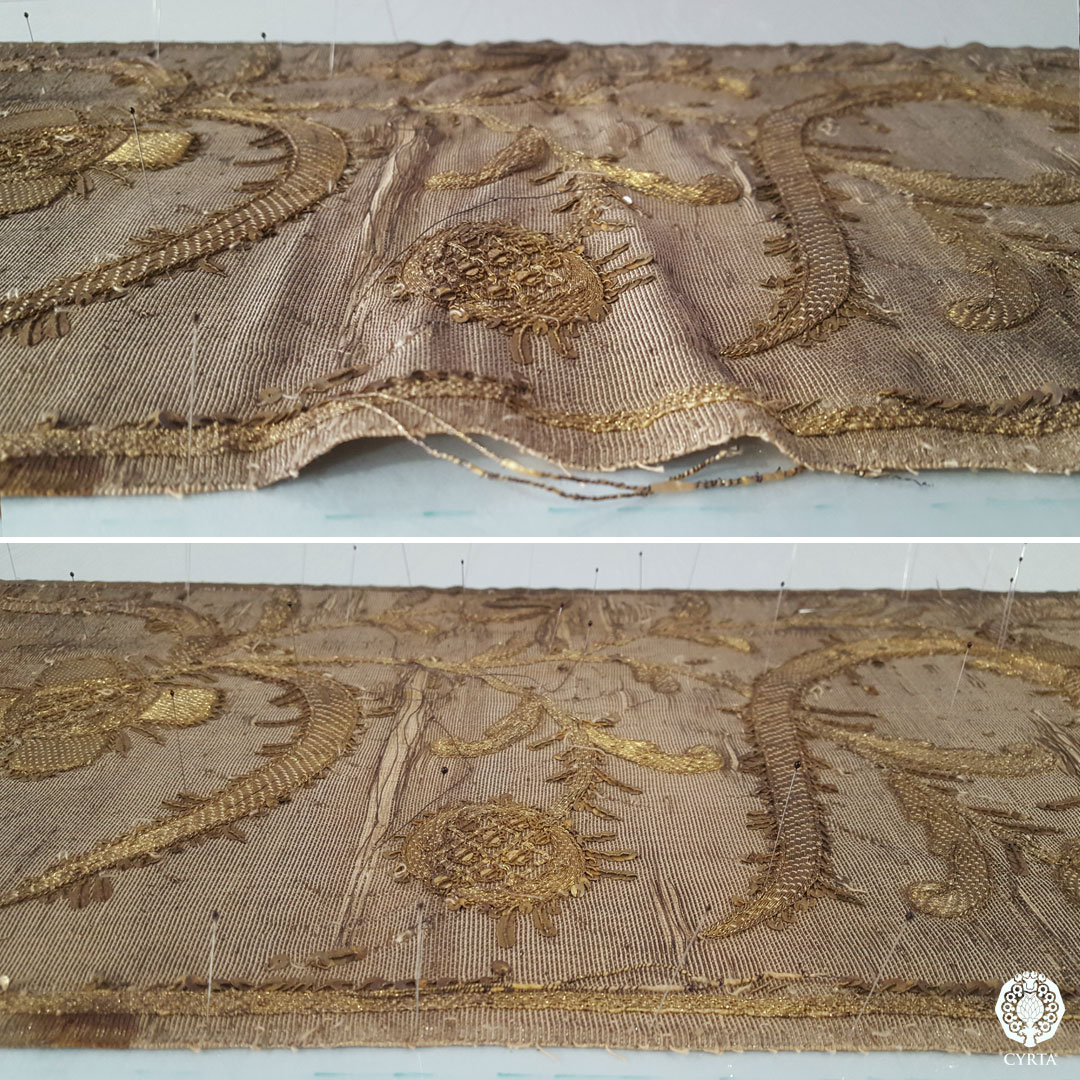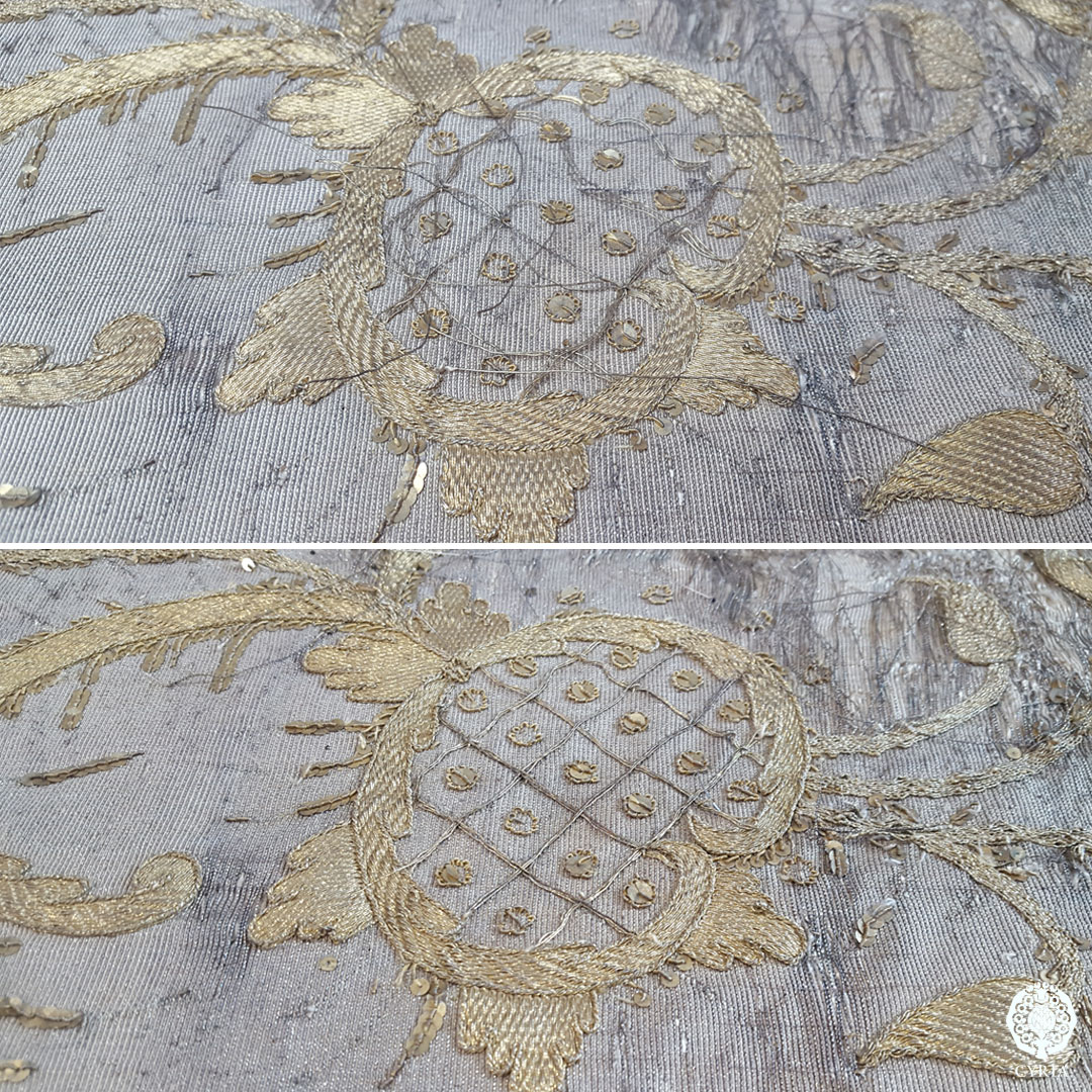 • Consolidación de los soportes textiles y de los motivos bordados que mostraban desgarros.