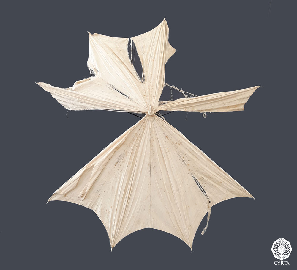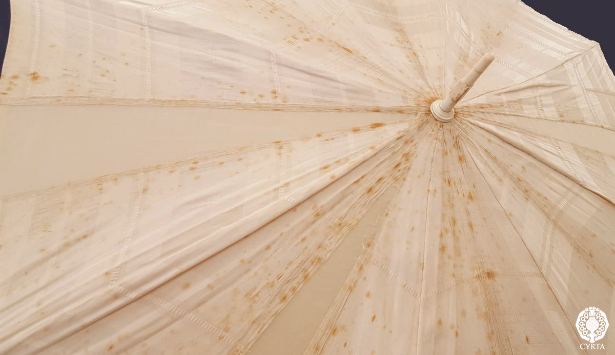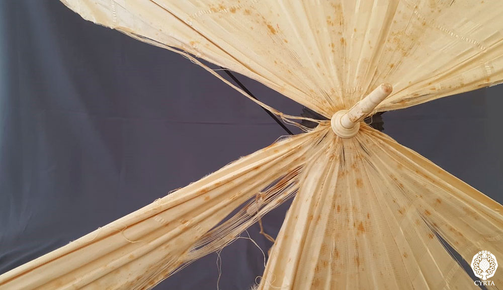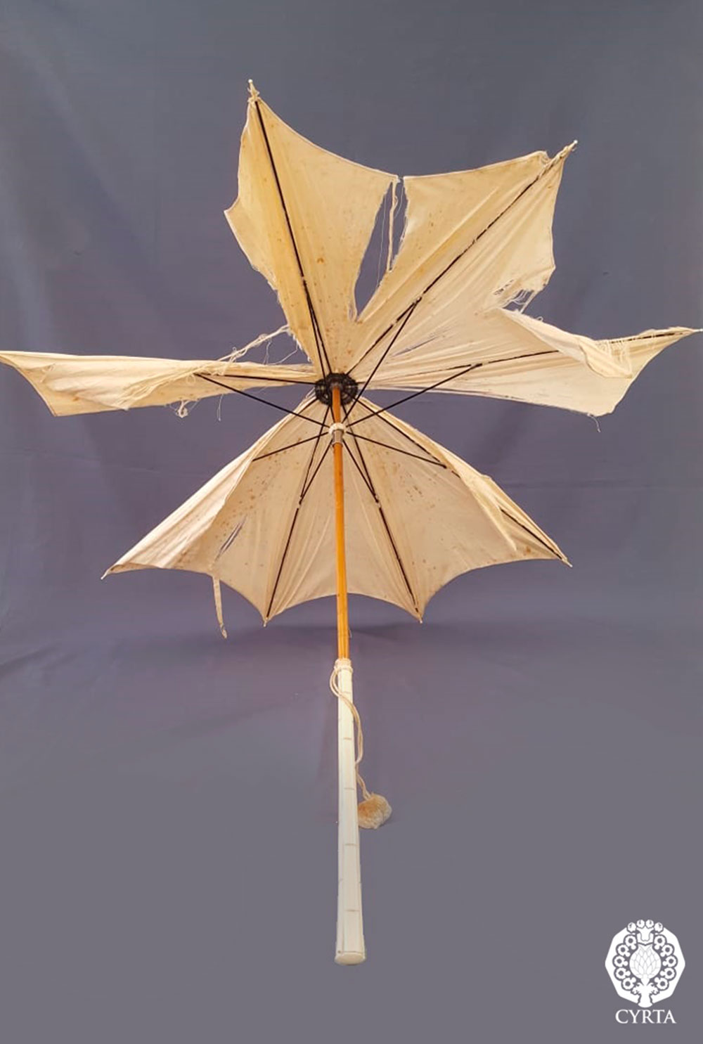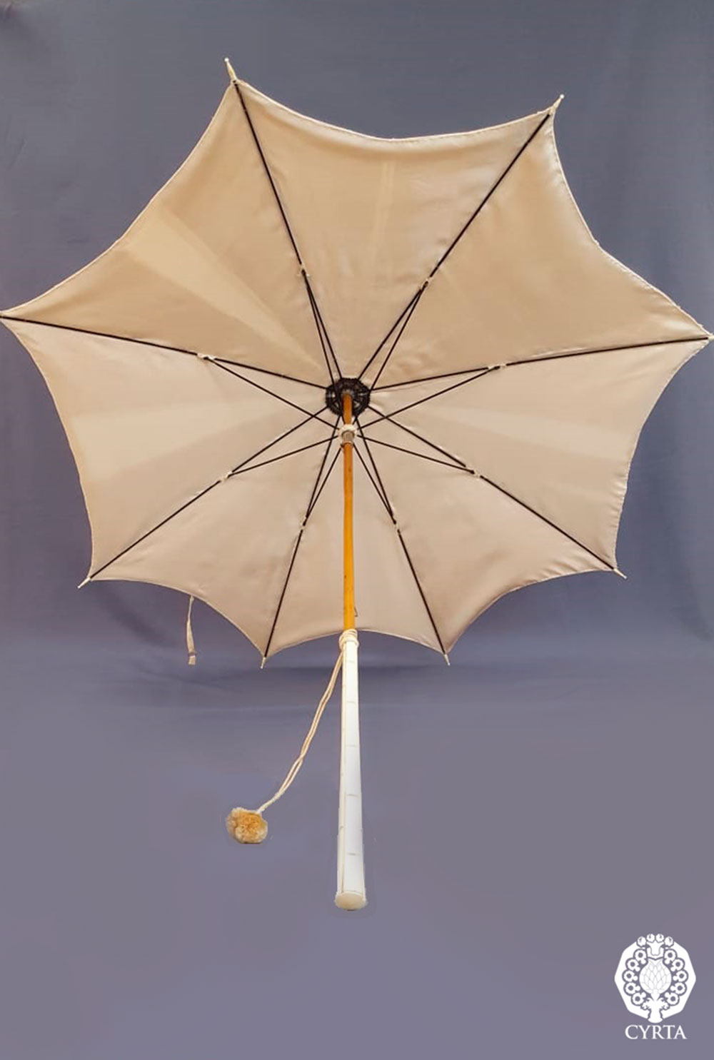 • Técnica: Tejido de seda montado sobre estructura de metal y puño de marfil.