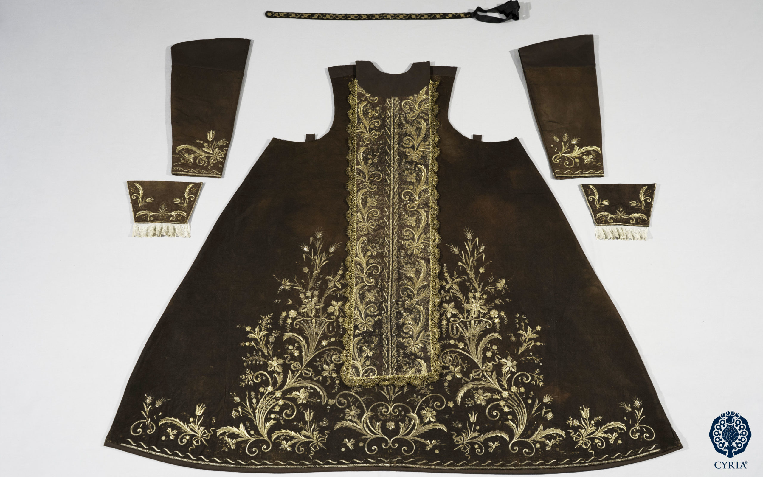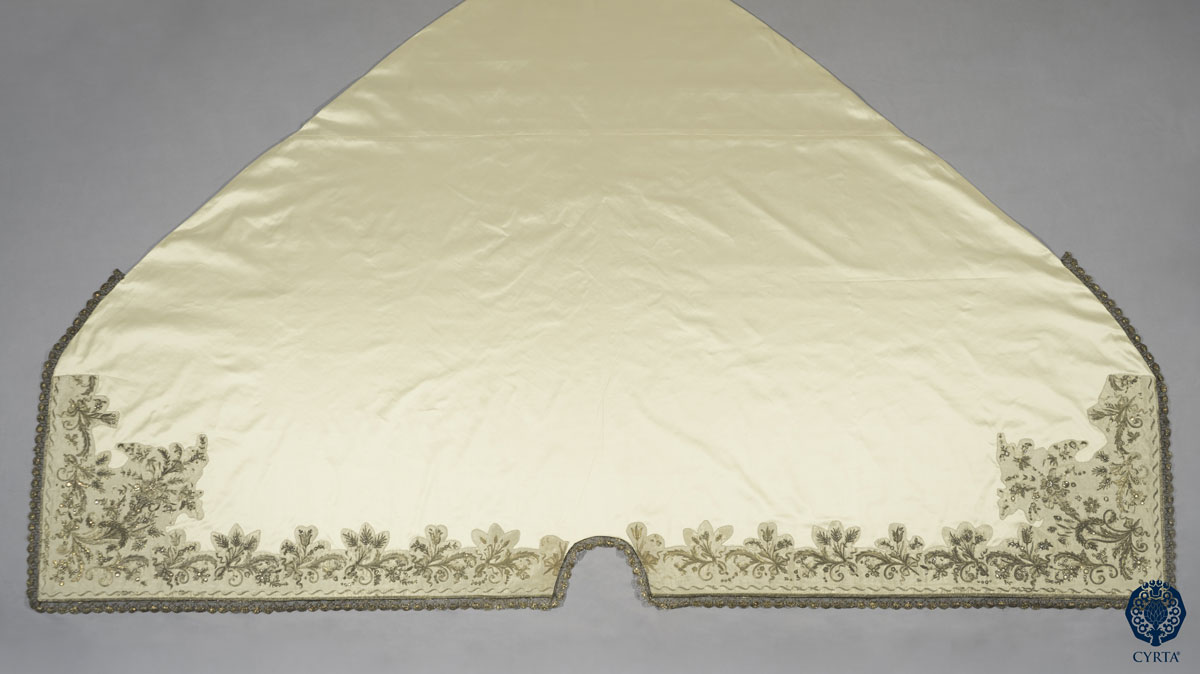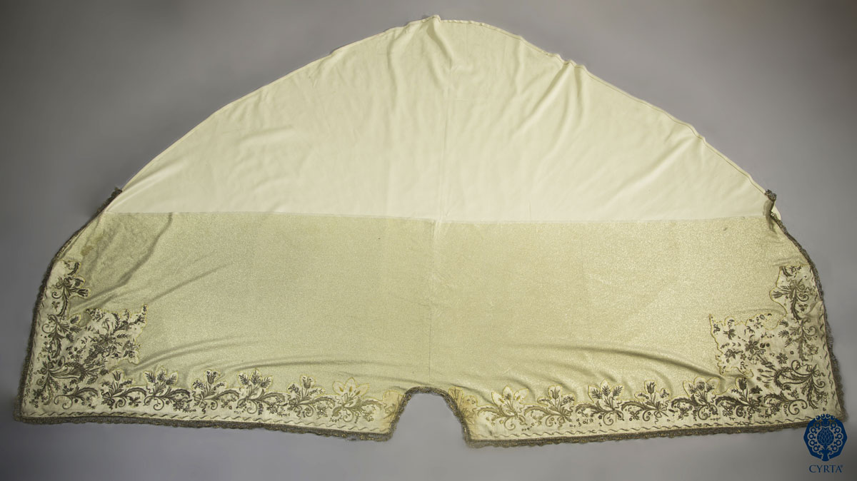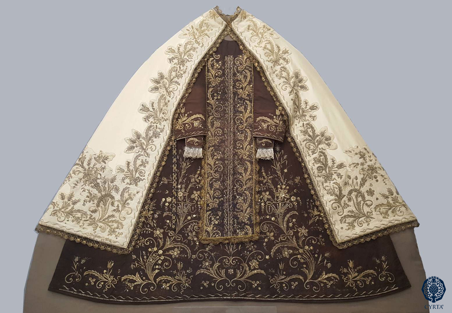 - Materiales: Tejido de Gro de Tours en seda, en color marrón, para el hábito y lamé de plata para la capa. Hilos de muestra en plata dorada para el bordado. Espejuelos, tachuelas polilobuladas en metal dorado. Encajes de tipo punto de España, realizados en hilos metálicos dorados, a bolillos.