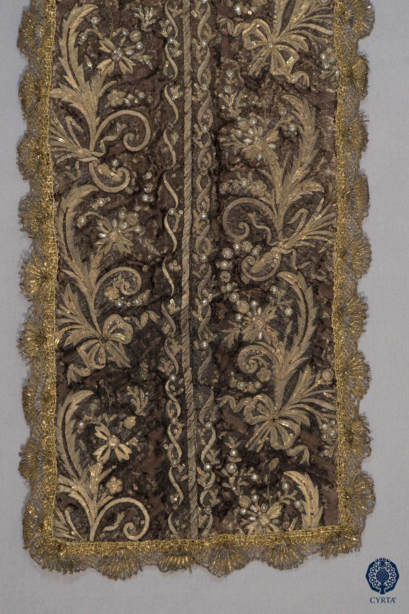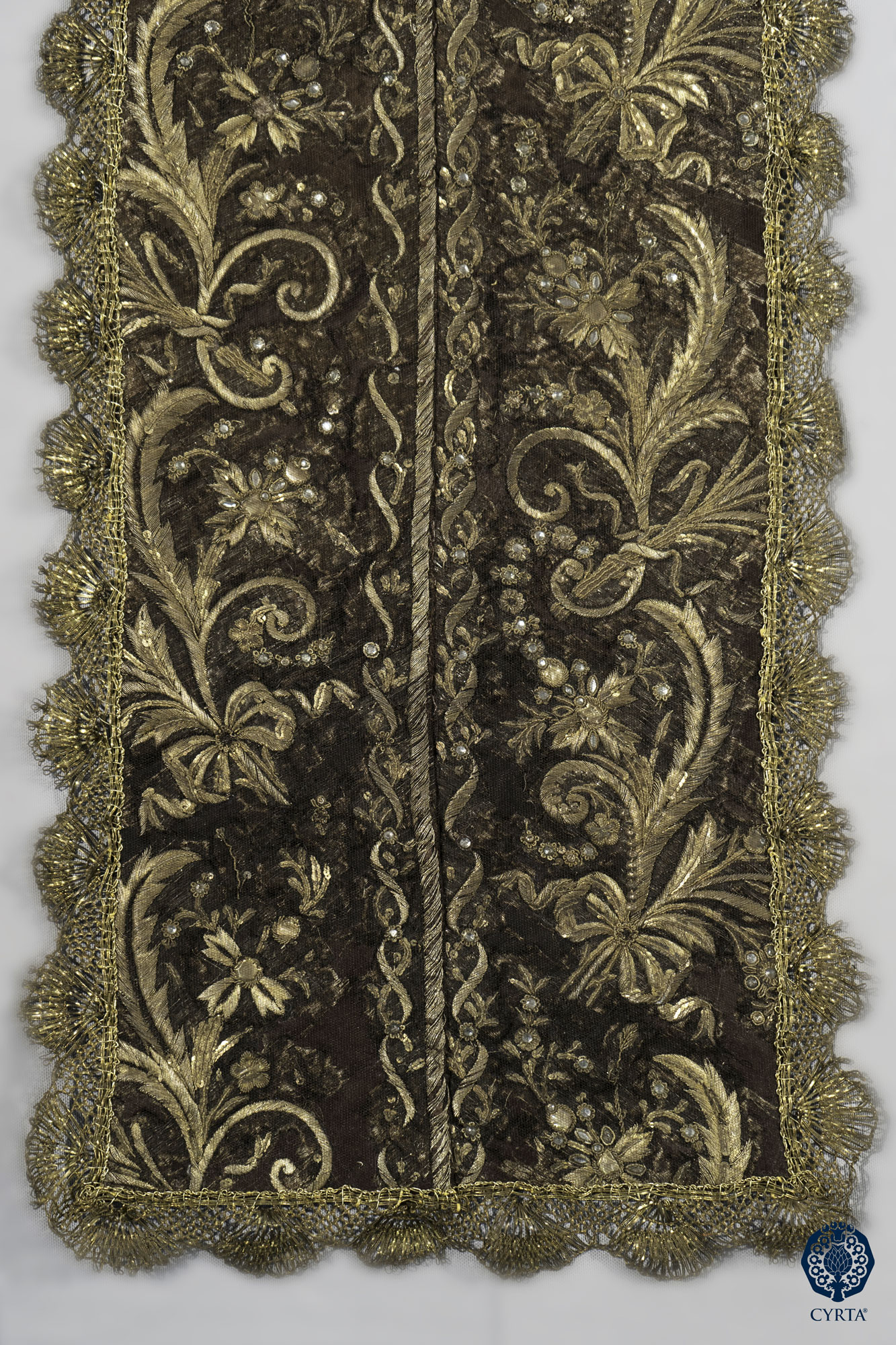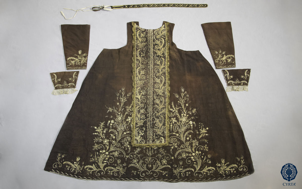 - Materiales: Tejido de Gro de Tours en seda, en color marrón, para el hábito y lamé de plata para la capa. Hilos de muestra en plata dorada para el bordado. Espejuelos, tachuelas polilobuladas en metal dorado. Encajes de tipo punto de España, realizados en hilos metálicos dorados, a bolillos.